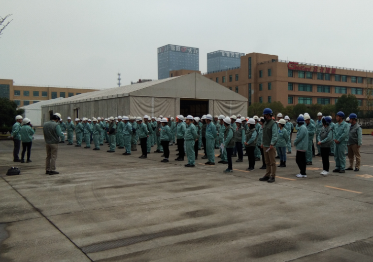 11时30分,随着紧急避难命令的下达,公司全体员工按指定线路紧急疏散,大约经过二分钟,124名员工已全部疏散到公司指定的紧急避难场地集合、点名。